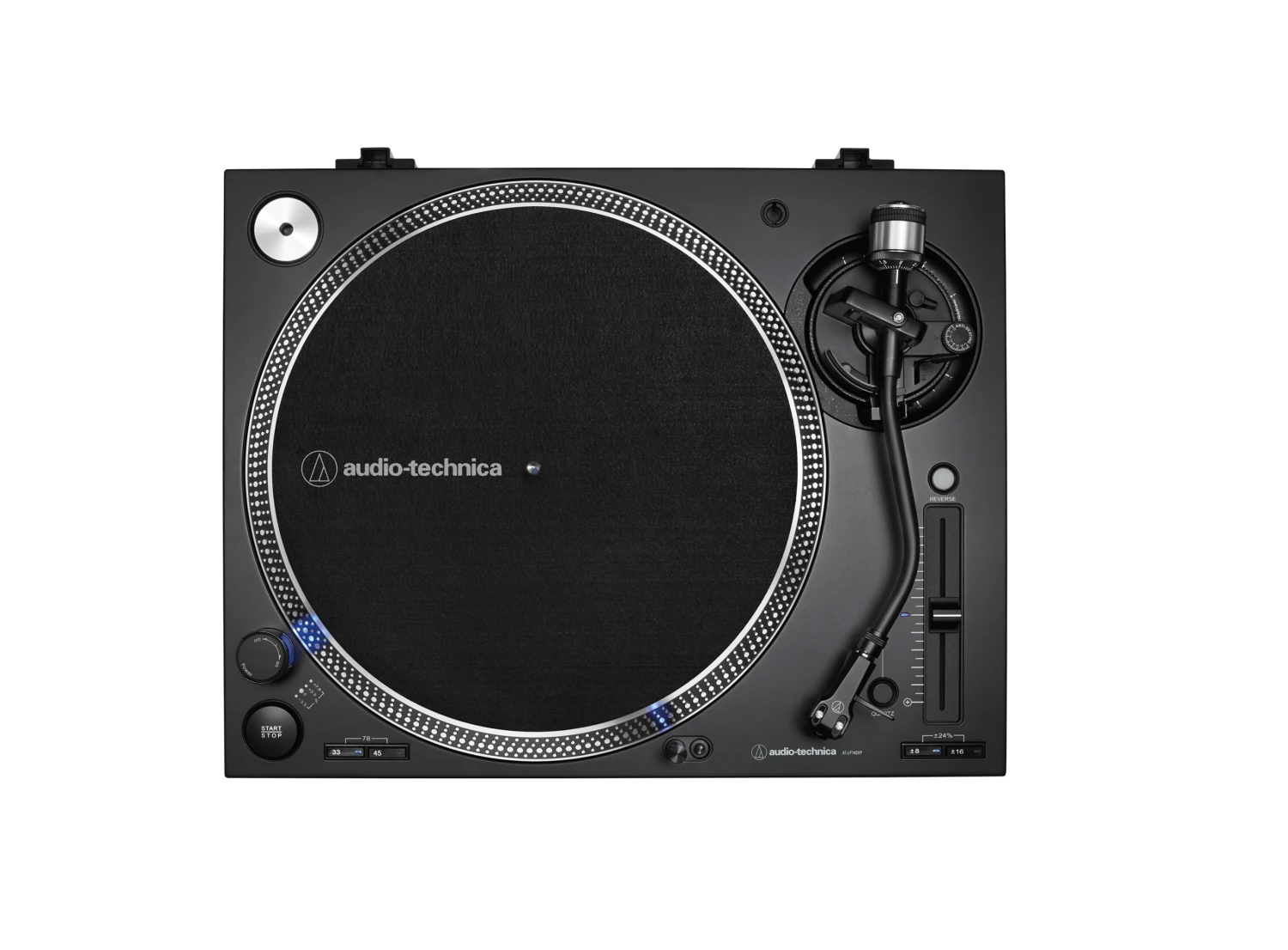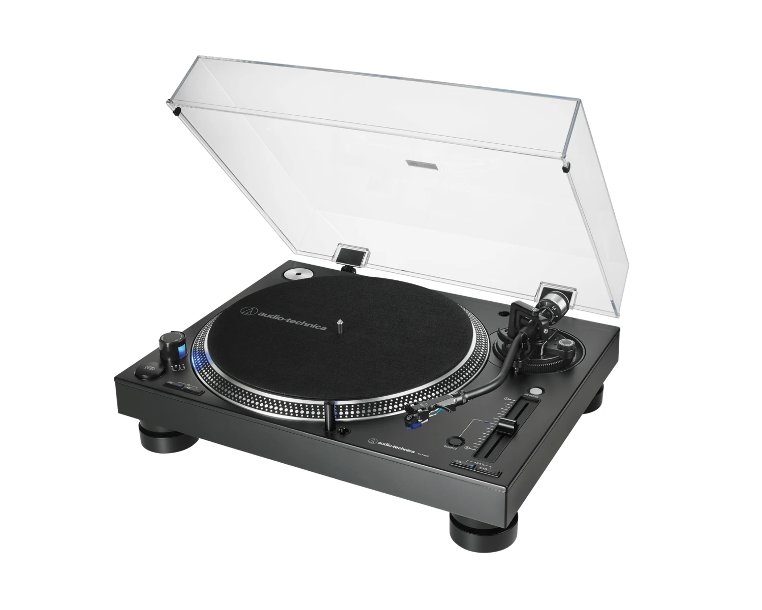 The AT-LP140XP fully manual professional DJ turntable features a high-torque direct-drive motor and anti-resonant, mass-damped, die-cast aluminum platter to ensure stable, on-axis rotation at 33-1/3, 45, and 78 RPM. It is equipped with an S-shaped tonearm with height adjustment, adjustable tracking force (counterweight) and adjustable dynamic anti-skate control.