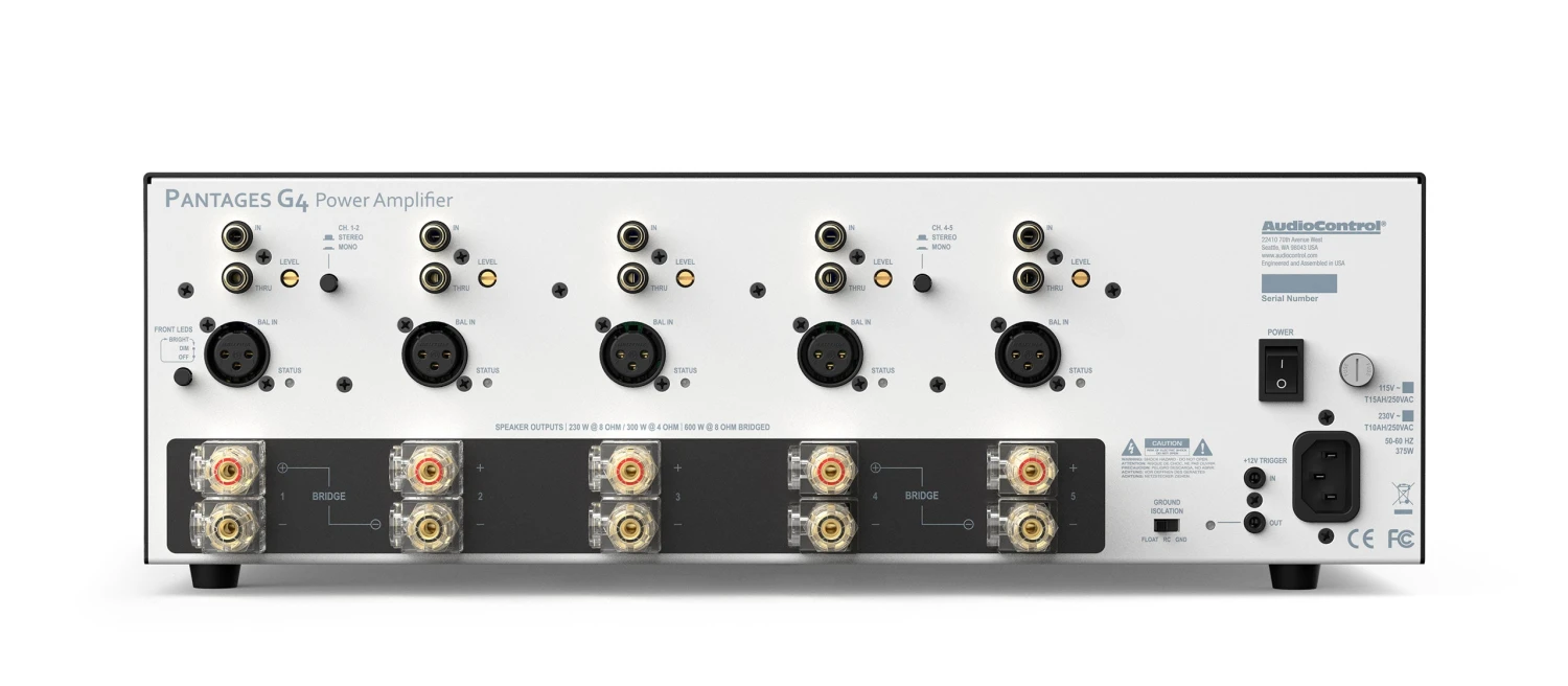 Incorporating AudioControlās unique, highly efficient, and cool-running Class H design, the Pantages G4 power amplifier achieves 230 watts per channel at 8 ohms and 300 watts per channel at 4 ohms, all channels driven. The Pantages G4 can also be configured for 600 watts at 8 ohms bridged on select channels to facilitate flexible configurations well beyond powering surround channels. AudioControlās LightDrive⢠built-in anti-clipping protection circuit safely eliminates any possibility of speaker-damaging clipping and distortion, even in extreme conditions.