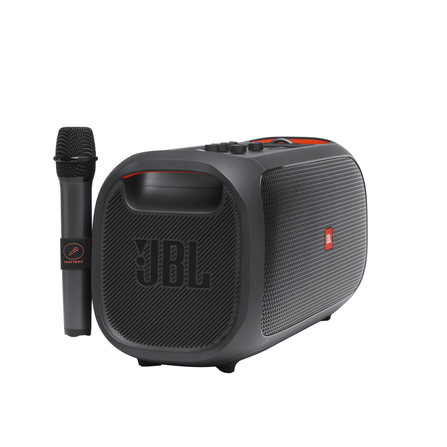 - JBL wireless microphone included – Sing without limits or wires. The JBL PartyBox On-The-Go comes with a JBL wireless microphone with a range of up to 10 meters.