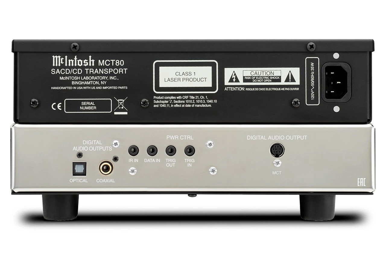 MCT80 includes 3 digital-only outputs in the form of 1 coax and 1 optical connector along with 1 of our proprietary MCT connectors. The MCT output offers a secure DSD connection for playback of the high definition audio on SACDs up to DSD128 levels. To take advantage of the MCT80’s unique SACD capabilities, it must be used with select McIntosh models that have an MCT input—which includes the aforementioned MXA80 and MHA150, plus the D1100, C52, C2600, C47 and D150 preamplifiers as well as the MA9000 and MA8900 integrated amplifiers. The coax and optical outputs support CD audio formats up to 24-bit/192kHz. For listening to CDs, MCT80 can be used with any product that contains a digital coax or optical input and a Digital to Analog Converter (DAC).