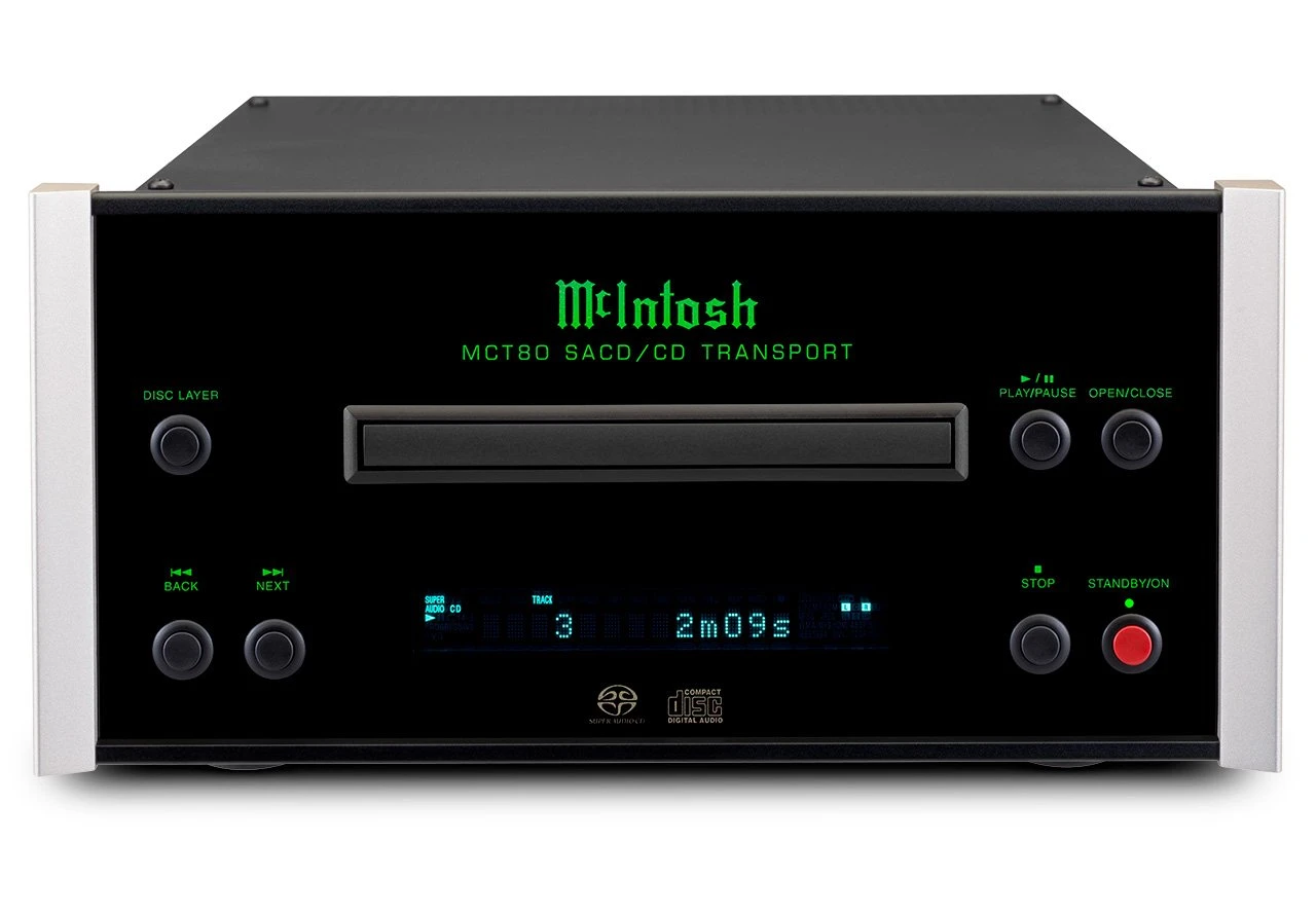 MCT80 features an improved transport with a die-cast aluminum tray in conjunction with an advanced digital servo for faster, quieter and accurate operation. All common disc types can be played including SACD, CD, CD-R, CD-RW (MP3 and WMA) and user generated DVD or CD Data Discs with music file formats including DSD (up to DSD128), WAV (up to 24-bit/192kHz), FLAC, MP3 and others. A disc’s audio data is read at twice the normal rate insuring better disc tracking and error correction processing. A twin laser optical pickup assures optimal disc reading. Power control and data ports integrate the MCT80’s operational state with other McIntosh system components. It’s wrapped in classic McIntosh styling with a polished stainless steel chassis, black glass front panel, illuminated logo and aluminum end caps.